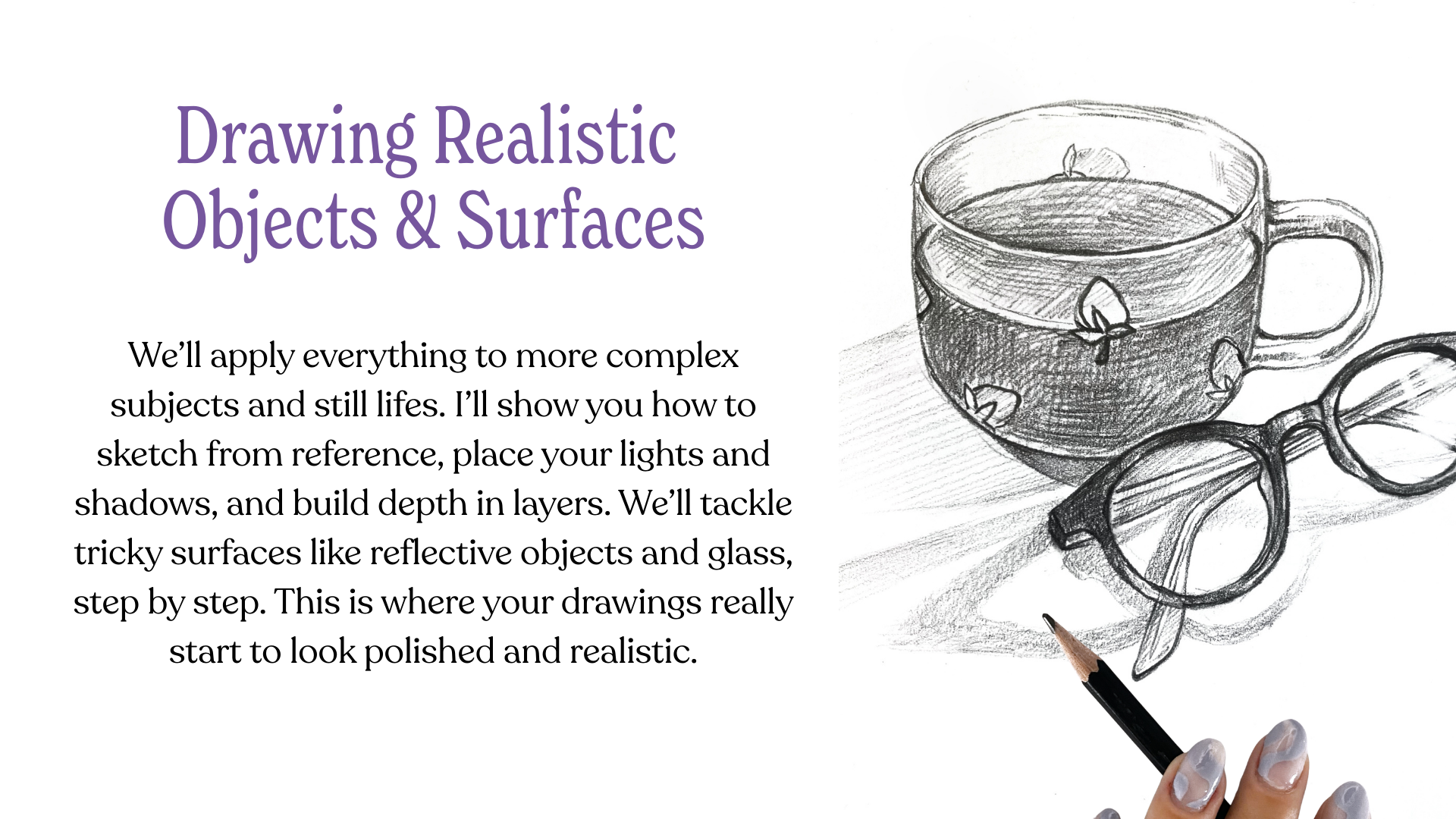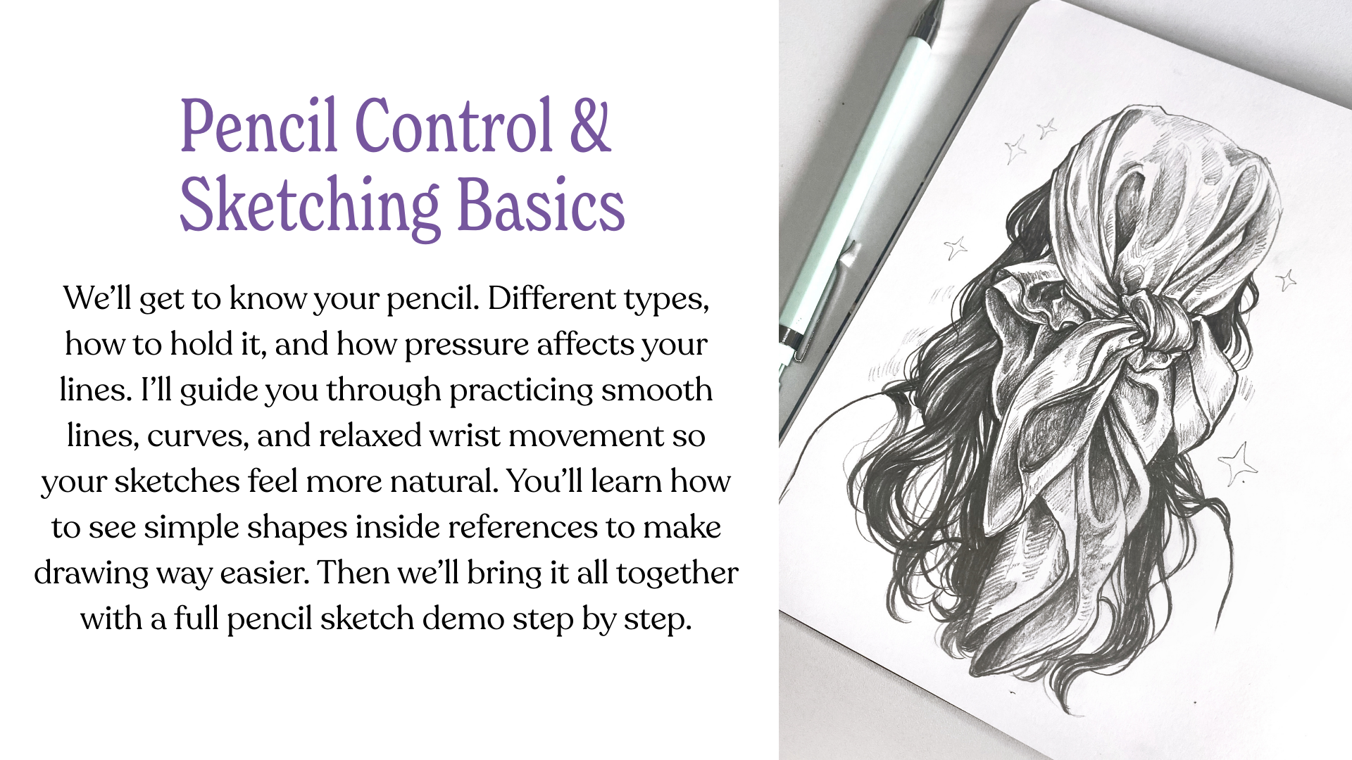 I will walk you through the basics - how to control your pencil, sketch lightly, and build your drawing step by step. Then we’ll focus on simple shading techniques, along with easy-to-understand lessons on light and values. You’ll learn how to place shadows, create contrast, and turn flat sketches into drawings that feel solid and three-dimensional.