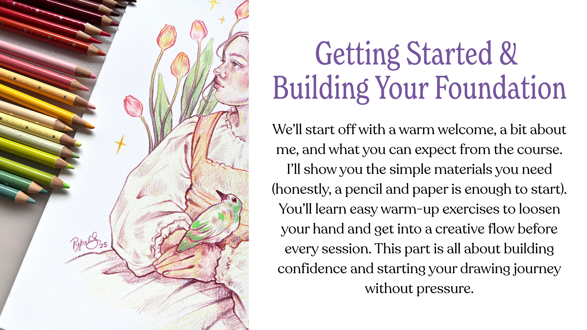 In my new online course, I keep my approach super chill and beginner-friendly. No pressure, just a space to pick up a pencil (or anything else) and start creating. Can’t wait to share my process and get you drawing with confidence! Join the waiting list and I will update you soon!